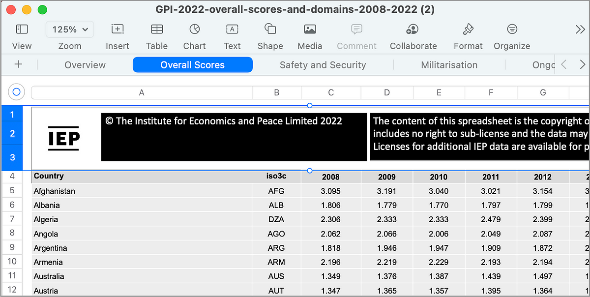 For our examples let’s use the“Global Peace Index” (GPI) data downloaded from the visionofhumanity.org website (located HERE).