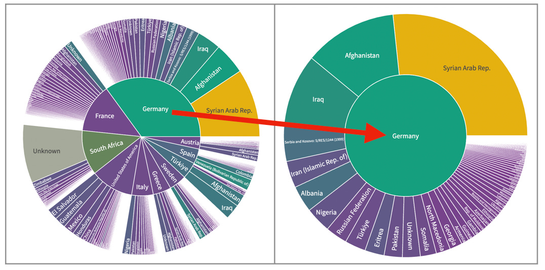 You can adjust the slider (on either end) to give a more focused year range. Additionally, with a Plotly sunburst chart, you can actually click on a country (from within the inner circle) to produce a more granular set of numbers: