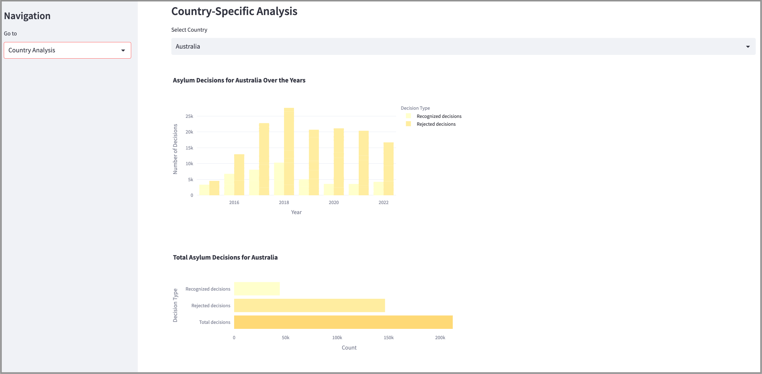 .The total number of recognized, rejected, and total decisions for the selected country is calculated and displayed using a horizontal bar chart (