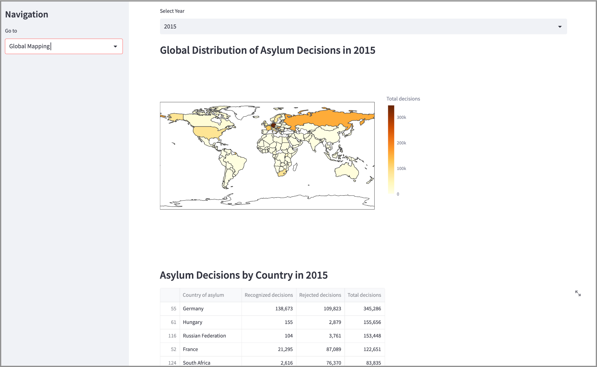function to display the global distribution of asylum decisions for a selected year. This involves creating a choropleth map to visualize the total asylum decisions by country.