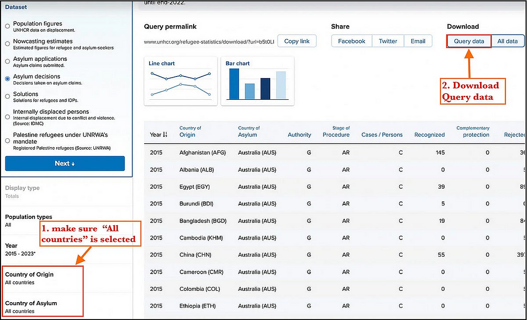 For this project, let’s retrieve the county of origin for each refugee and the country of asylum.